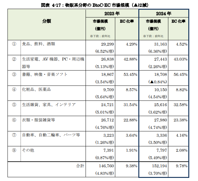 物販系分野の内訳では、「食品、飲料、酒類」が3兆1,163億円と最大規模となり、日常消費財分野を中心にECの利用が拡大していることがわかります。これは、食品・飲料・酒類カテゴリーが他の物販カテゴリーよりも高い成長率を示していることを示しています。こうした動きは、消費者がオンラインでの日常生活関連商品の購買をますます活発化させていることの表れです。