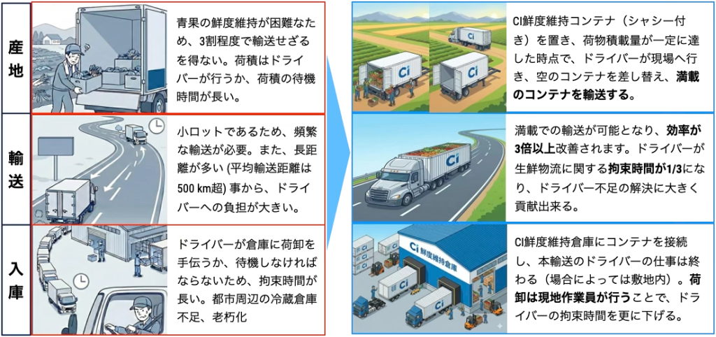 従来の生鮮物流は、鮮度維持のための「低積載」と、ドライバーによる手荷役や長い待機時間による「長時間拘束」が構造的な課題であり、ドライバーへの負担が甚大でした。「クールイノベーション 鮮度維持コンテナ・倉庫」を活用し、鮮度劣化を恐れた小口頻繁配送から、産地での「在庫化(計画輸送)」へ転換。積載率を大幅に向上させ、輸送効率を3倍以上に高めます。