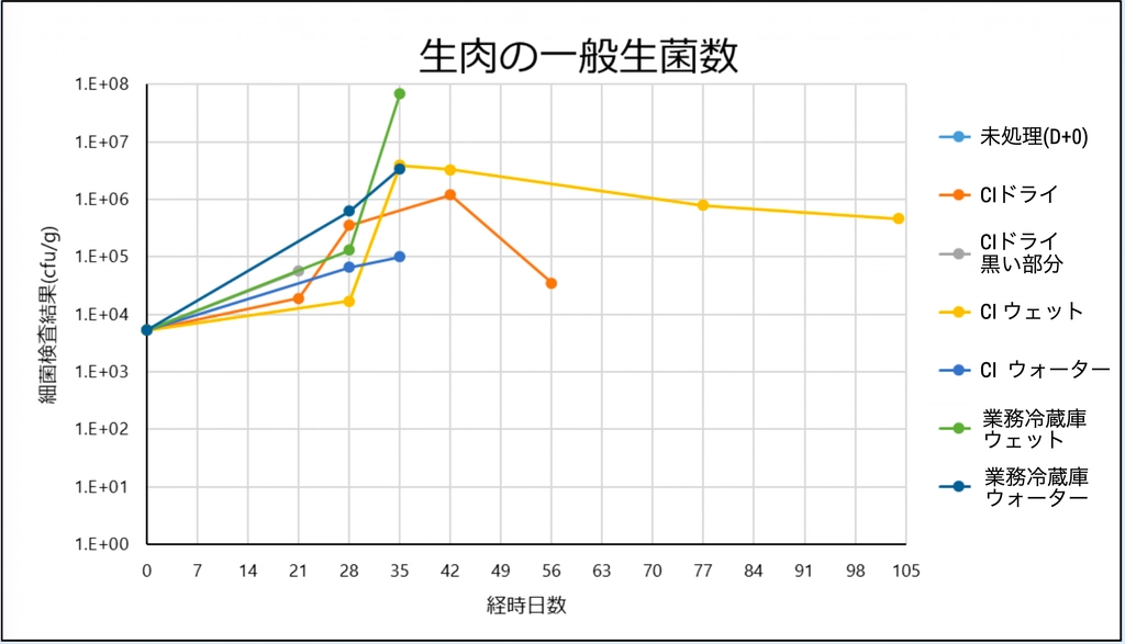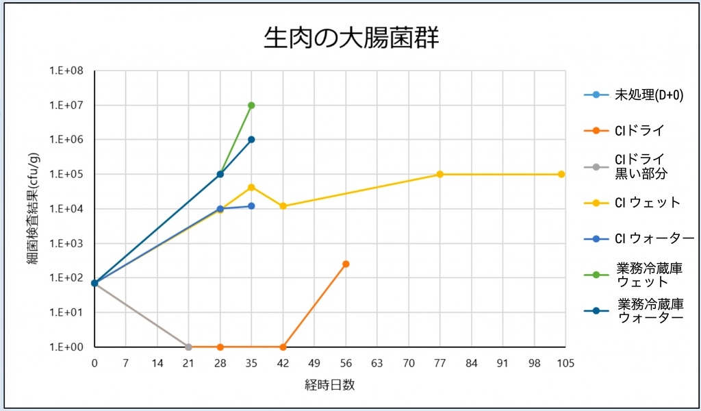 - 一方、クールイノベーション 冷蔵庫(CIウェット:黄色ライン)では、104日経過後でも 4.6 x 10^5 cfu/g に抑えられており、通常の冷蔵庫の約1/100以下の菌数で推移しています。